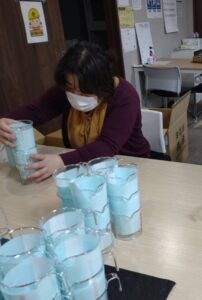 計量カップの検品作業と梱包作業をしています。