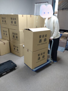 1セットまとめたら箱に詰めて業者さんが来られたら台車に乗せて車まで運びます。