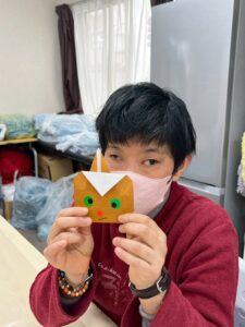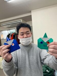 この日は節分がもうすぐ…ということで折り紙で鬼を作りました。