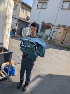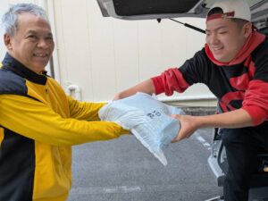 窓から袋に入った検品済みのエプロンを受け取り、車で待機してる利用者さんへ渡していきます。